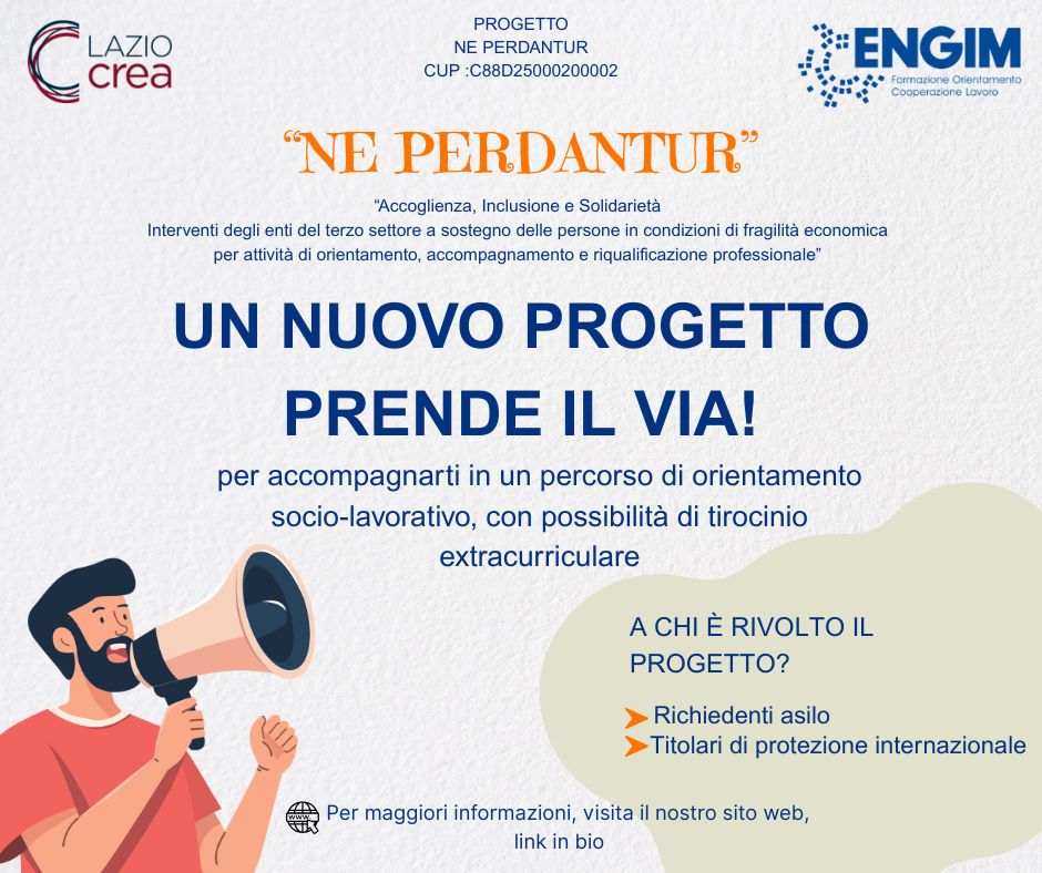 In un contesto sociale ed economico sempre più complesso, ENGIM ETS, in partenariato con ENGIM San Paolo, avvia il progetto “NE PERDANTUR” - Accoglienza, Inclusione e Solidarietà-Interventi degli enti del terzo settore a sostegno delle persone in condizioni di fragilità economica per attività di orientamento, accompagnamento e riqualificazione professionale; CUP :C88D25000200002 finanziato dalla Regione Lazio -, con l’obiettivo di offrire un sostegno concreto a richiedenti asilo e/o titolari di protezione internazionale e sussidiaria favorendo il loro inserimento attivo nel mondo del lavoro.